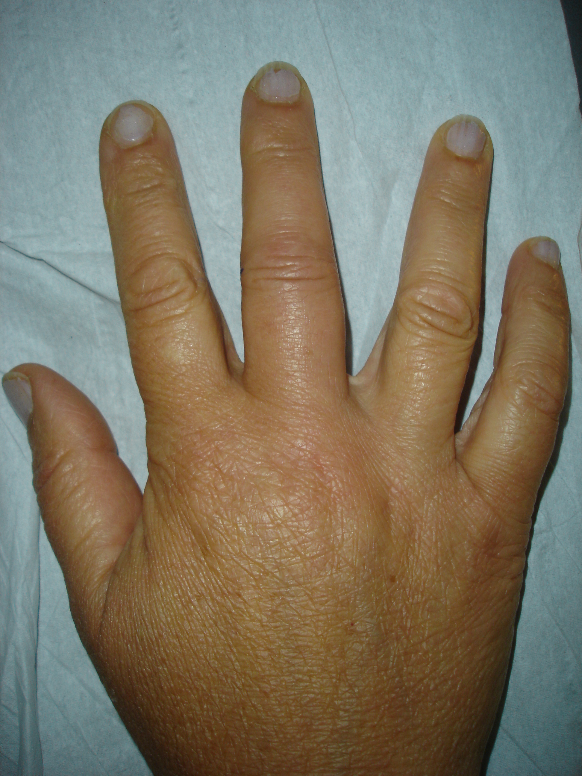La utilización de los implantes de oro es más frecuente en grandes articulaciones. En este artículo se presenta la colocación de implantes en una artrosis interfalángica proximal del 3º dedo de la mano. La flexión está limitada y la paciente refiere impotencia funcional por dolor que limita su actividad profesional (es ginecóloga). Mediante el examen clínico se observa la tumefacción y engrosamiento digital. En la exploración radiológica se aprecia el pinzamiento articular especialmente en el lado radial de la articulaciòn. Se pueden verlos implantes de oro periarticulares. Debido a las particularidades de la inserción capsular en las articulaciones interfalángicas, los implantes distales se colocan más próximos a la articulación que los implantes colocados a los lados del cuello de la primera falange