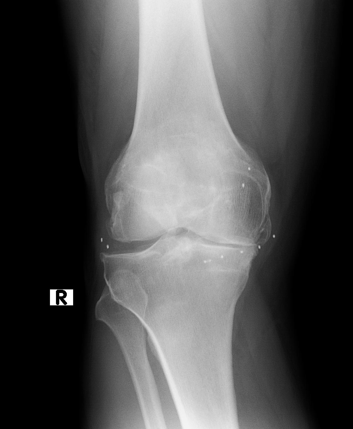 Los implantes de oro actúan a nivel de los tejidos blandos periarticulares. Los cambios funcionales y la desaparición del dolor son muy evidentes, en cambio no se observa cambio radiográfico alguno, al menos en el corto y mediano plazo. A continuación se observa un estudio de RX de un paciente con implantes de oro en ambas rodillas, con un marcado genu varo, y un cambio funcional y de mejora sintomática y de calidad de vida, inesperado incluso para el propio paciente.