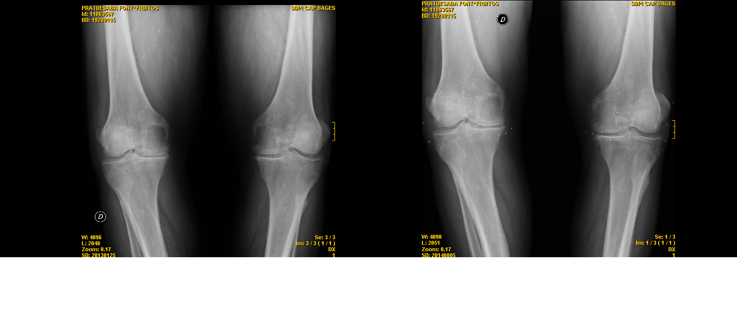 Los implantes de oro periarticulares actúan en las partes blandas de la articulación y es claro el beneficio clínico que se obtiene. Pero hasta ahora no se había objetivado el rol de los implantes a nivel del cartílago hialino en pacientes humanos. A continuación se observan las RX de un paciente octogenario con gonartrosis bilateral y genu varo tras dieciocho (18) meses de colocación de implantes. La buena evolución clínica es paralela a los cambios radiológicos que se observan especialmente en la articulación tibiofemoral interna en donde la degradación cartilaginosa es mayor. Se comparan las radiografías anteriores y posteriores a los implantes, con un aumento significativo de la interlínea articular.